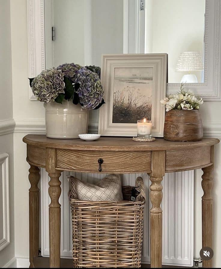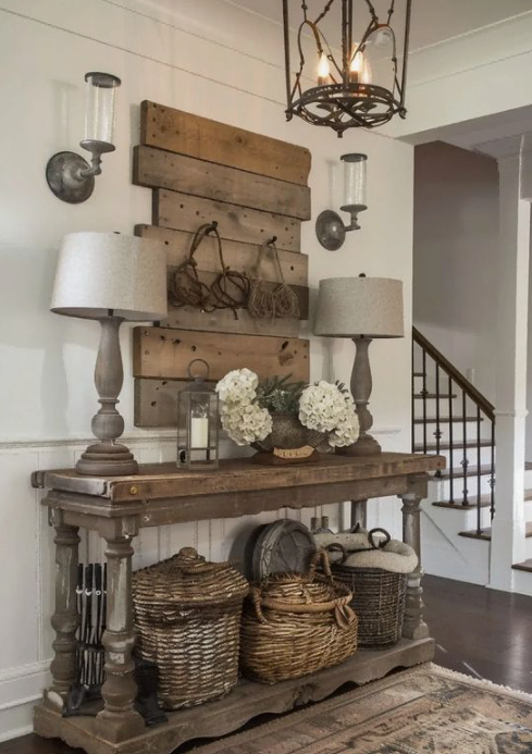 Elige una pieza vintage que sea el centro de atención de tu entrada. Puede ser un banco antiguo con mucho encanto, una consola de madera desgastada o un perchero vintage. Esta pieza marca el tono y proporciona un punto focal.
